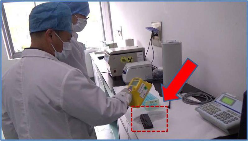 值班人员和应急小组工作人员发现放射性核素洒落位置并进行表面污染测定,迅速标出污染范围(彩色粉笔),以免其他人误入。并脱掉受污染的衣服和鞋子留在污染区后,人员立刻离开污染区。在活性区出口的通过间用手脚衣物污染检测仪检测是否存在体表污染,如无体表污染即可离开活性区。