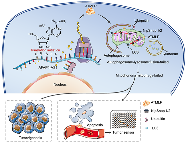 近日,周光明教授和裴海龙副教授研究团队协同苏州大学附属第二医院研究团队发现由长链非编码RNA翻译的小分子多肽具有显著的促癌作用。该研究发现,电离辐射通过增强AFAP1-AS1的1313位腺嘌呤甲基化,诱导ATMLP小分子多肽的“非帽依赖”翻译。ATMLP定位于线粒体,通过抑制受损线粒体与溶酶体的结合逃脱自噬,进而促进正常细胞的恶性增殖。相关成果在《Advanced Science》在线发表,题为“The Tumorigenic Effect of lncRNA AFAP1-AS1 is Mediated by Translated Peptide ATMLP Under the Control of m6A Methylation”,https://doi.org/10.1002/advs.202300314。
