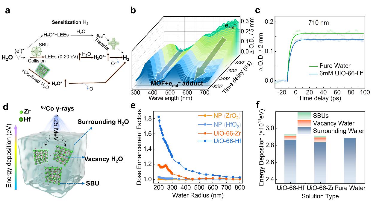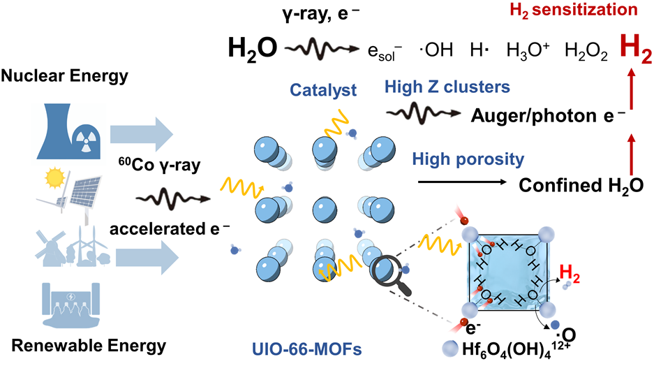 近日,我中心南京航空航天大学马骏教授和苏州大学王殳凹教授团队合作发现,高原子序数金属有机框架(MOFs)材料UiO-66-Hf-OH可以敏化电离辐射制氢,使氢气产额提高22倍,能量转化效率高达11.5%,且具有很好的循环稳定性。该氢气产额的提升源于MOFs本征的限域结构,其高原子序数金属结构单元的阵列排列,能有效地增加康普顿/俄歇电子的吸收截面,在纳米孔道中引发水辐解的链式反应,从而极大地提升了水辐射析氢效率。