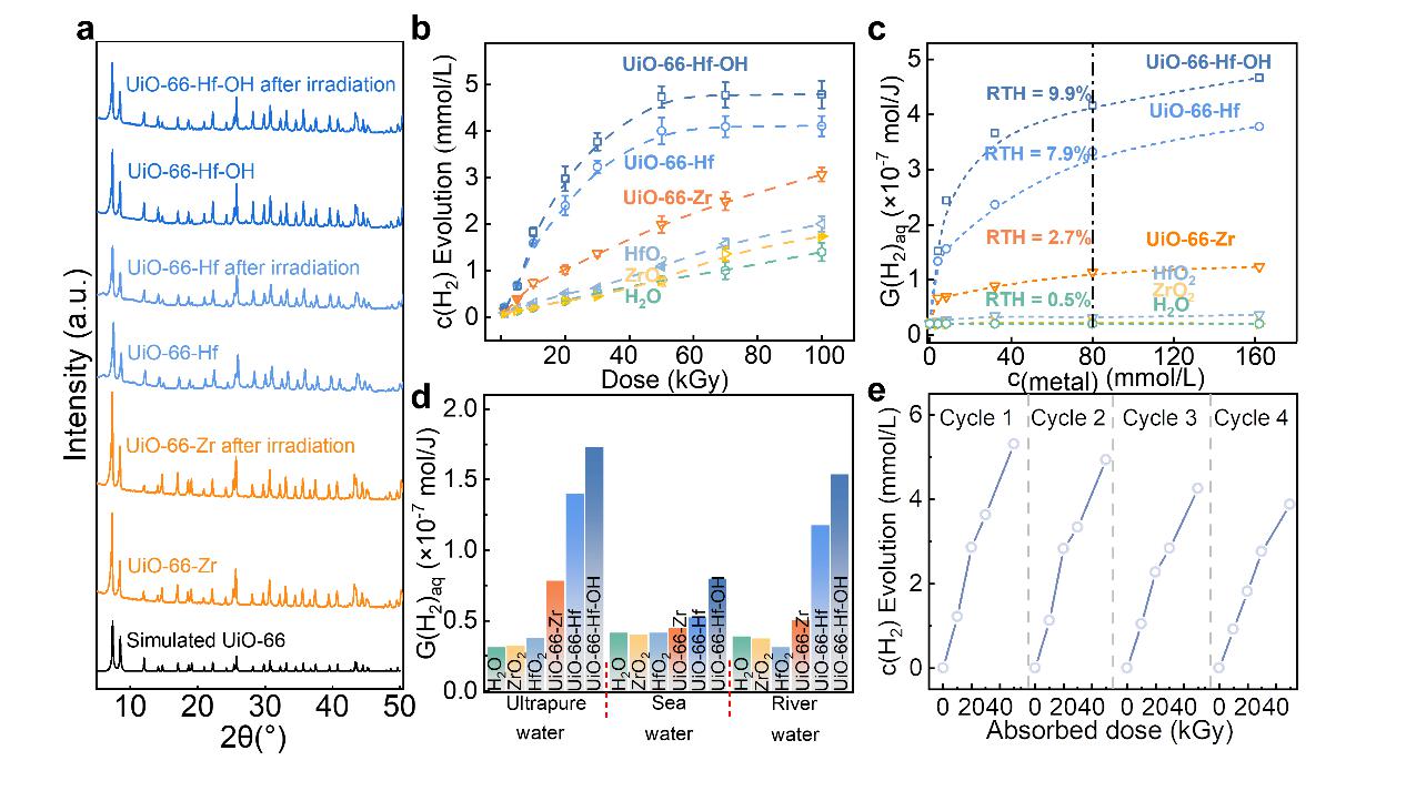 研究团队通过成熟水热法合成了多种UiO-66材料并用于辐射析氢测试,结果表明,金属中心的原子序数、官能化配体均与其辐射稳定性与析氢性能密切相关,材料特殊的孔道结构既有助于二次电子的碰撞与能量传递,也有助于水分子的激发与电子吸附解离过程,析氢性能超过常规的金属纳米氧化物10倍以上。此外,由于辐射分解与传统光、电法在能量沉积、激发方式、反应路径截然不同,辐射催化析氢的优势在于适用于各类自然水体,避免了耗能的纯化过程。研究团队采用未处理的长江水、海水进行了比较测试,发现其析氢效果与实验室纯水几乎相同,证明该催化剂具有优良的抗污染性能,具有广阔的应用前景。同时,该UiO-66基催化剂在进行长时间辐射产氢测试后,依然保持较高的稳定性和循环性,例如,在经历了四次高剂量200 kGy的辐照后,UiO-66-Hf-OH依然可保持74%的催化产氢效率。
