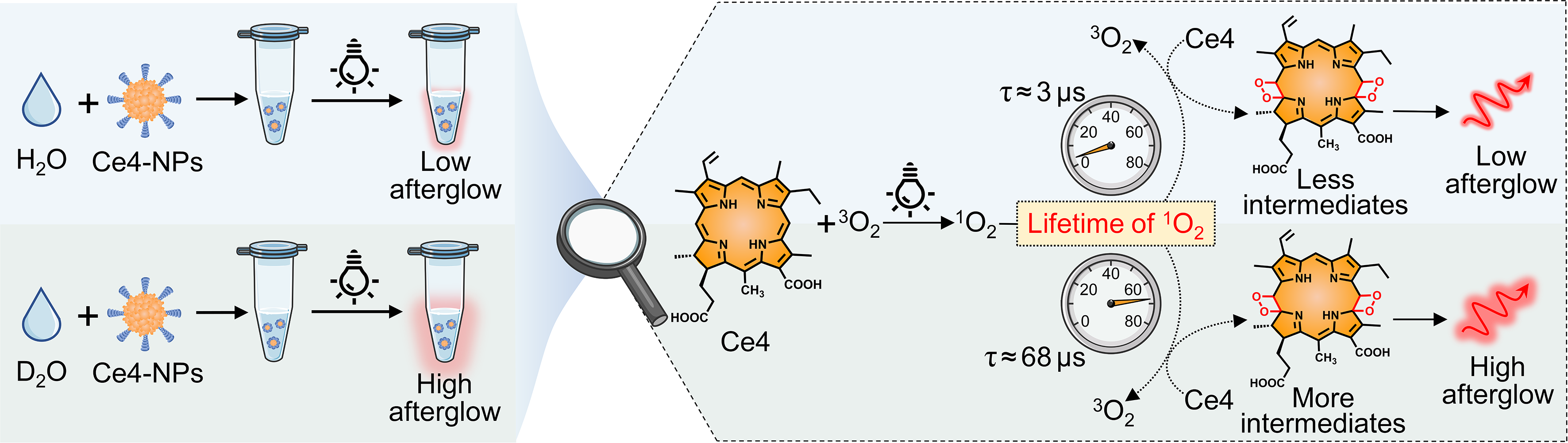 图:Ce4-NPs在H2O和D2O中余辉亮度具有差异的示意图
