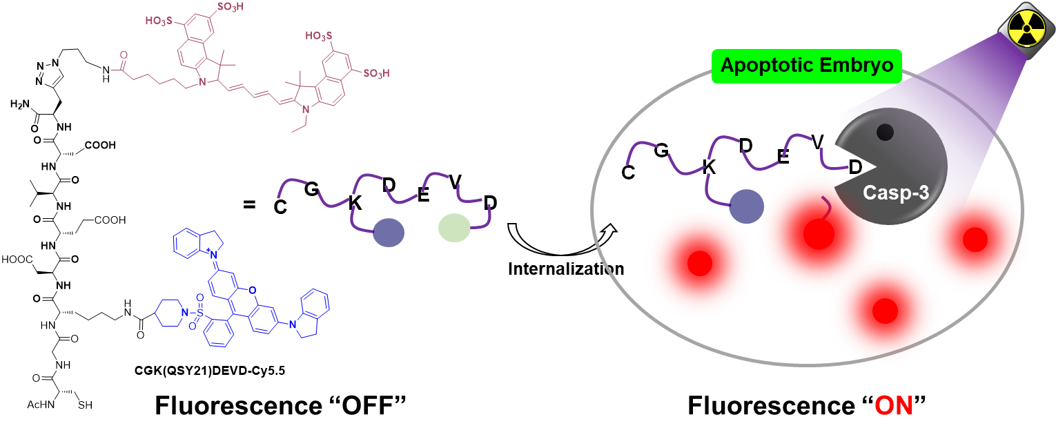 在最新的研究进展中,史海斌教授课题组创新性提出设计并构建了一种Caspase-3特异性激活型小分子荧光探针(CGK(QSY21)DEVD-Cy5.5),将其成功地应用于小鼠胚胎凋亡过程的实时可视化和发育评估研究。该探针主要由近红外荧光染料Cy5.5、荧光猝灭剂QSY21和Caspase-3酶特异性识别和剪切的底物Asp-Glu-Val-Asp (DEVD)三个部分组成。细胞实验研究证实,探针可以被化疗药物顺铂或X射线照射诱导发生凋亡的胚胎中Caspase-3酶特异性剪切,释放出明亮的近红外荧光信号。进一步在小鼠模型中,经过X射线照射的小鼠子宫内,探针表现出明显增强的近红外荧光,通过活体荧光扫描,可以对胚胎的凋亡情况进行实时无创的示踪,克服了以往胚胎生长发育质量评价方法的诸多缺点。该研究成果有望为胚胎发育情况的无创可视化评估提供新手段。