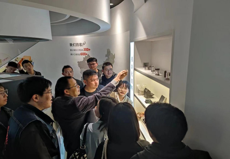 在张磊总监的带领下,研讨会成员参观学习了华克医疗的核技术应用科普展览厅,深入了解核技术的应用、华克公司的发展现状及其产品的应用与售后等相关知识。同学们在探究核技术与医学的关联时,也触发了如何进行理论与临床联合的思考,同时,华克医疗对于核医学智能服务方面的研究,也让参观的同学感慨互联网加智能医学的发展前景,对于它成为未来我国老龄化和医患问题解决的一个可能性尽行了探讨。