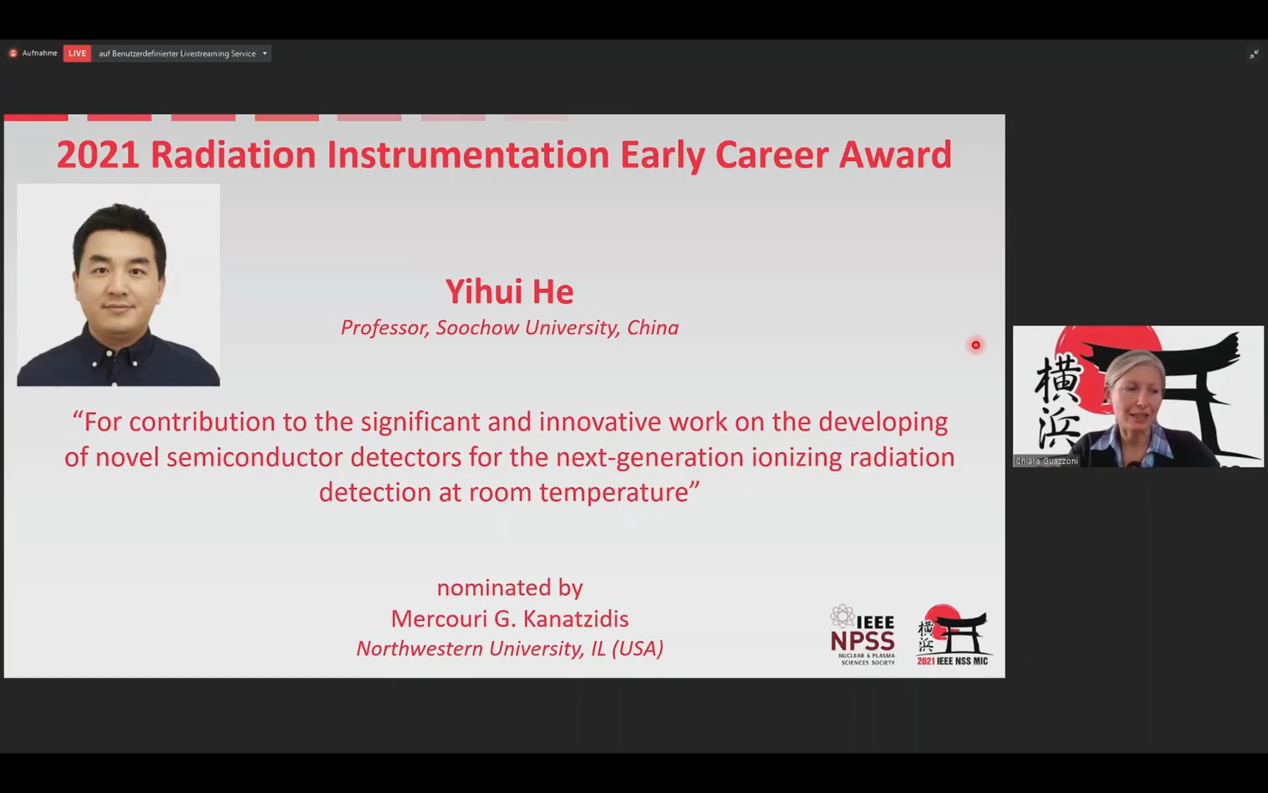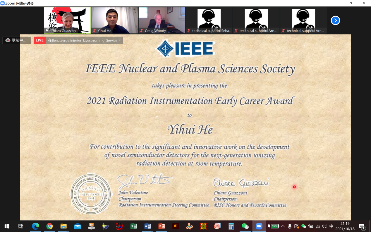 10月18日,在日本横浜举办了IEEE核科学研讨会和医学成像会议(IEEE NSS MIC) 暨第28届室温半导体探测器国际研讨会议(RTSD)。我中心何亦辉教授荣获2021年IEEE核与等离子体学会(NPSS)辐射仪器青年科学家奖(Radiation Instrumentation Early Career Award),该奖项表彰了何亦辉在开发新一代室温核辐射半导体探测器方面的显著贡献和创新。由于疫情原因,大会为其举办了线上颁奖。IEEE核与等离子体学会(Nuclear and Plasma Sciences Society)2004年起设立该奖项,每年遴选一名在辐射探测领域有杰出贡献的青年科学家。