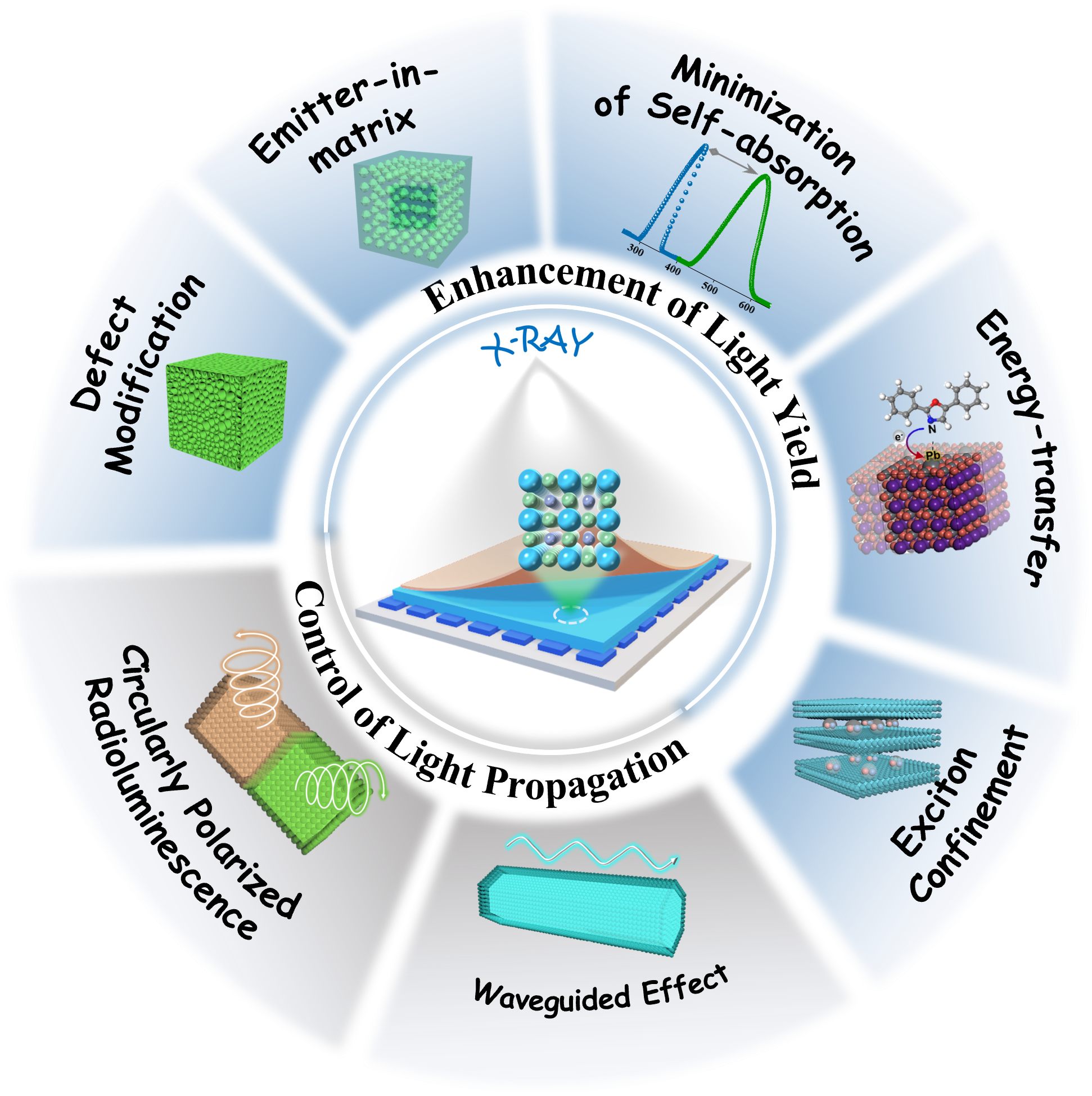 闪烁体是一类特殊的荧光材料,可以将高能射线或高能粒子转换为低能量的紫外-可见-近红外等光信号,它在医学成像、高能物理和工业应用等众多领域中发挥着至关重要的作用。钙钛矿闪烁体是一类新兴非常极具竞争力的新型闪烁体材料,其具有高量子效率、短发光寿命、优越的X射线吸收能力、以及低成本的晶体制备方法等优势,近年来被广泛用于X射线探测与成像的研究。深入理解钙钛矿结构与闪烁性能之间的构效关系,有助于通过结构调控与优化来提升钙钛矿闪烁体对X射线的探测与成像能力。对于闪烁体而言,高光产额以及高光子利用效率将直接影响X射线成像的质量。基于此,王殳凹教授和王亚星教授团队结合团队研究经验,从化学设计的理念出发,总结了提高钙钛矿闪烁体光产额的调控策略,以及通过控制光的传输方向来提高X射线成像分辨率的研究策略。在此基础上,研究团队也提出了钙钛矿闪烁体目前所面临的挑战以及未来的研究方向,为钙钛矿闪烁体发展提供了新的思路。
