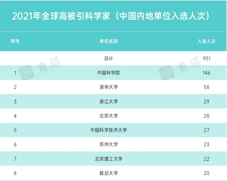 2021年度,中国科学院入选科学家数量依旧排名全球机构第2位,清华大学位列全球机构第8位,这是清华大学继2019年排名第19位上升到2020的第9位后,位次再一次上升。从中国内地高校入选数统计来看,清华大学位居首位,达58人次;浙江大学共有29人次入选,紧随其后;北京大学和中国科学技术大学各有28和27人次入选,表现不俗。苏州大学有23人次,位居第六。