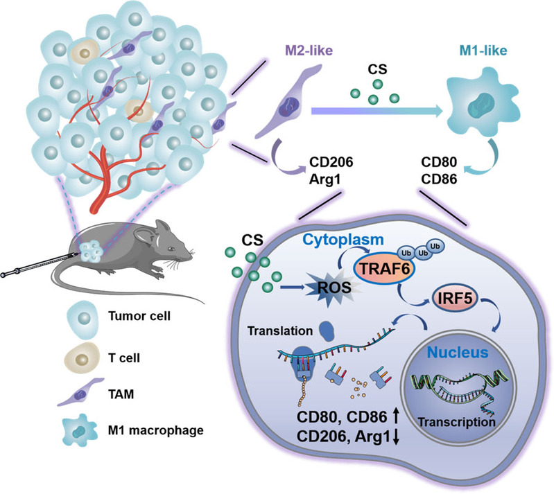调节抑制性肿瘤免疫微环境(TIME)重建免疫监测系统是非常有前景的肿瘤免疫疗法。实体瘤中存在较为丰富的肿瘤相关巨噬细胞(TAMs),通常表现为促进肿瘤生长的M2型巨噬细胞,对肿瘤生长、转移、侵袭发挥着重要作用。此外,它们还通过降低T细胞的活性抑制适应性免疫。相反地,M1型巨噬细胞具有较强的肿瘤杀伤和抗原提呈能力,可通过激活抗肿瘤T细胞反应而增强抗肿瘤效果。因此,将TAMs从免疫抑制性的M2表型极化为抑制肿瘤生长的M1表型是抗肿瘤免疫治疗的重要策略。然而,利用无机纳米颗粒的固有性质调控TAMs表型鲜有报道,其调控作用机制尚不明确。