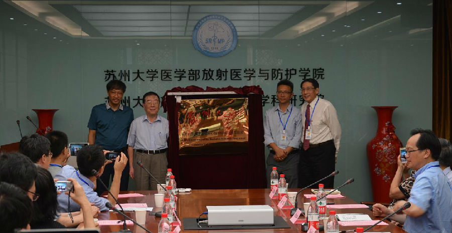 2015年8月2日,我校与美国哥伦比亚大学医学中心联合成立的卫星实验室揭牌仪式暨2015辐射与环境毒理研讨会在苏州大学医学部402幢一楼会议室隆重举行。美国哥伦比亚大学医学中心放射肿瘤系副主任及原辐射研究协会主席Tom K. Hei教授、军事医学科学院龚诒芬教授、中国疾病预防控制中心辐射防护与核安全医学所刘青杰教授、香港城市大学林港坤老师、复旦大学放射医学研究所邵春林教授和沈波教授、北京大学邵根泽教授和杨根副教授、军事医学科学院周平坤教授和张博教授、中国医学科学院北京协和医学院基础医学研究所张业教授、上海中医药大学附属市中医医院龚学忠教授、上海交通大学医学院附属第九人民医院葛盛芳教授和张赫教授、中科院生物物理研究所杭海英教授、第二军医大学海医系科研与实验教学中心韩玲教授、中科院合肥物质科学研究院韩伟教授、中国科学院近代物理研究所胡步荣教授、华南农业大学梅曼彤教授和洪梅教授、苏州大学附属第二医院刘玉龙教授、苏州大学医学部邹学海书记、苏州大学医学部放射医学与防护学院院长柴之芳院士、书记曹建平、副院长许玉杰和周如鸿以及我院的全体师生出席了本次会议。揭牌仪式由院长柴之芳主持。