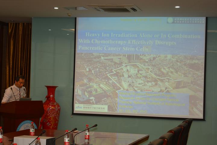 接着是崔星研究员的题为“HEAVY ION IRRADIATION ALONE OR INCOMBINATION WITH CHEMOTHRAPY EFFECTIVELY DISRUPTS PUTATIVE PANCREATIC CANCERSTEM CELLS”的精彩学术报告。讲座中,崔星研究员首先为师生们介绍了日本放射线医学综合研究所的历史,并阐述了日本放医研在日本以及世界学术界的重要地位,着重介绍了重离子治疗中心的情况。并且表示非常欢迎我们放射医学与防护学院的优秀学子及年轻教师能够选择到日本放医研深造学习。随后,崔星研究员以自己所在研究组的主要研究成果展开了报告。崔星研究员的报告由浅入深,他为在场的师生详细介绍了重离子在临床肿瘤治疗的优势与特色,以及近年来世界学术界有关重离子治癌的前沿的研究成果。崔星研究员的报告内容丰富、风趣幽默,赢得了在场师生的阵阵掌声。