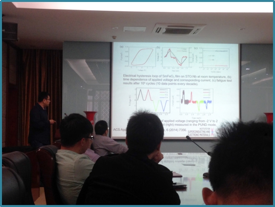 程振祥教授给大家作了题为《多铁材料的性质研究及应用》的学术报告。多铁性材料在存储设备和传感器中的应用具有巨大潜力,程教授结合单相多铁材料、磁电耦合的性质特点和应用向大家介绍了他在铁性材料领域的研究成果,如BiFeO3 、 BiFe0.5Mn0.5O3,和BTFO15等。报告结束后程振祥教授耐心地回答了老师和同学们的提问,精彩的报告在掌声中结束。