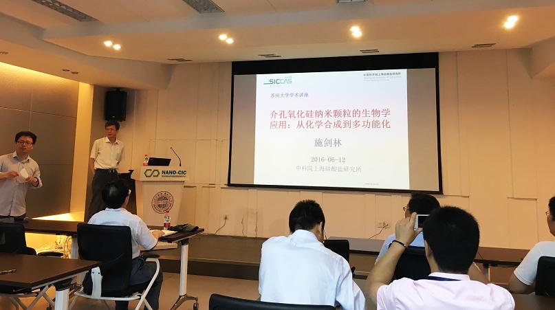 6月12日上午,中国科学院硅酸盐研究所原所长、国家杰出青年基金获得者、973首席科学家、长江学者特聘教授施剑林,应我校放医学院院长柴之芳院士和纳米学院副院长刘庄邀请在苏大独墅湖校区作了题为“介孔氧化硅纳米颗粒的生物学应用:从化学合成到多功能化”的学术报告。报告会由刘庄主持,医学部放射医学与防护学院、纳米科学技术学院、材料与化工学部等部分师生参加了报告会。