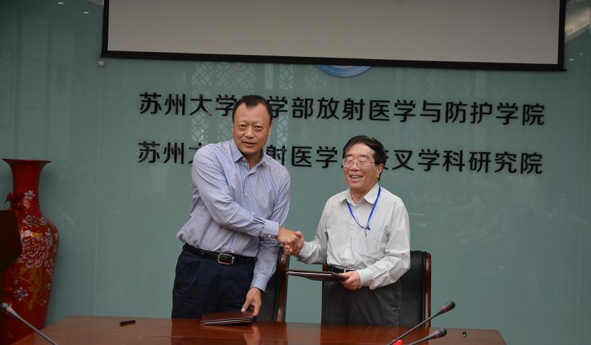 北京全域医疗技术有限公司董事长程政和苏州大学放射医学协同创新中心院长柴之芳共同为“苏州大学放医学院—全域战略合作”签字并揭牌。