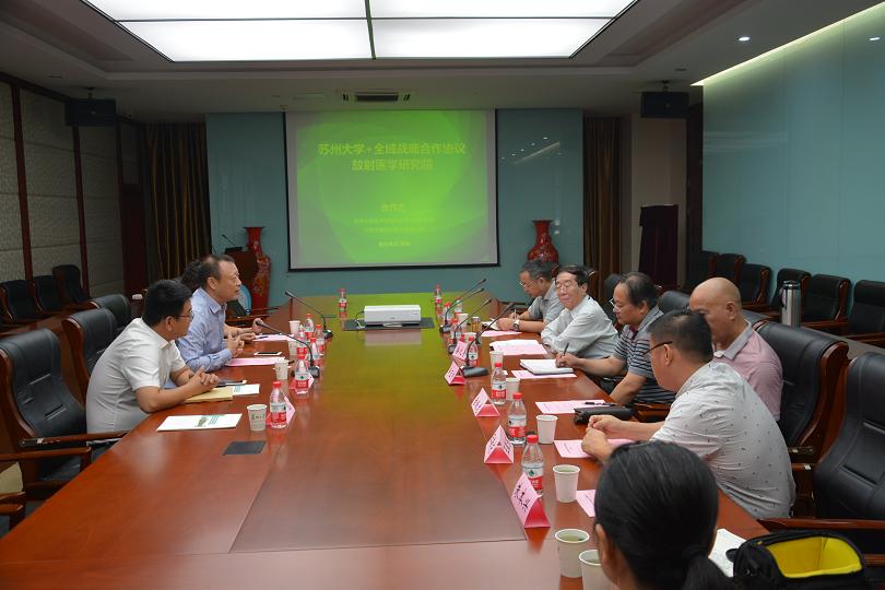 2016年9月13日上午苏州大学放射医学协同创新中心—全域医疗技术有限公司战略合作签字暨揭牌仪式在苏州大学独墅湖校区举行,参加本次仪式的有北京全域医疗技术有限公司董事长兼总裁程政、副总裁陈道光、省区经理叶晓春、市场经理付蕊;苏州大学放射医学与防护学院院长柴之芳、书记曹建平、副院长许玉杰、院长顾问全跃龙、主任王敬东、徐加英和朱本兴。会议由院长柴之芳主持。
