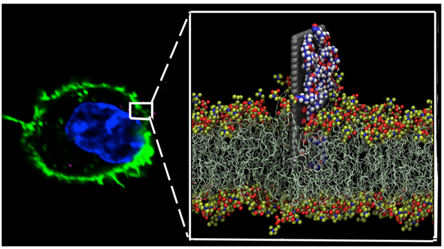 细胞之间能够相互交流,并且将信号传递给其它类型的细胞。周如鸿教授,通过与中国科学院过程工程研究所马光辉研究员等人合作,在最新一期的《Nature Communications》上发表的论文发现,聚合物包被的石墨烯虽然不会被巨噬细胞内吞,但却会加速巨噬细胞膜流动性、促进巨噬细胞迁移速率并诱导巨噬细胞产生大量炎症相关细胞因子,从而触发人体细胞强烈的免疫响应。细胞能够感知外来异物(纳米材料)的入侵,然后触发一枚”信号弹”(以细胞活素的形式)引起其它免疫细胞的响应,比如辅助T细胞(将信号转发)和杀手T细胞(杀死感染的细胞)。同时,周如鸿教授等通过超级计算机的大规模仿真模拟,发现聚合物能够将纳米材料紧密的“粘”在细胞膜表面促进初始的信号传导过程。