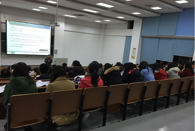 会后,昆山杜克大学黄英强教授为中心放射医学专业的本科生开展了医学物理专业硕士研究生宣讲活动。黄教授就医学物理专业的范畴及前景,以及昆山杜克大学医学物理硕士研究生专业的课程设置及申请流程等进行了详细介绍。张晨杰同学作为我校2016届放射医学专业本科毕业生,现就读于昆山杜克大学医学物理硕士研究生,与同学们一起分享了他在申请、学习、生活中的切身体会。整个宣讲会在与会师生们的热烈问答和讨论中落下帷幕。