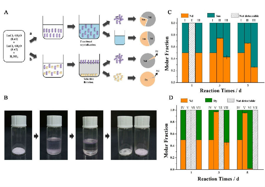 在相同反应条件下,采用硼酸盐熔融的方法镧系元素(除Pm)在整个镧系周期中从前至后形成六种不同的晶体结构,进而镧系元素被划分为六个不同的组分。六种不同组分的镧系硼酸盐产物在中心金属配位环境、空间群、硼酸根聚合形式,晶体结构等方面均存在显著差异,该发现打破了传统存在的由镧系收缩现象所导致的镧系元素固体化学行为同一性的认识。基于镧系元素相同条件下硼酸熔融反应中周期性变化的认识,对是否可以利用镧系元素的晶格差异性实现镧系元素间分离做进一步研究。将可生成两种不同晶格结构的镧系元素以相同的摩尔量混合后再与硼酸盐熔融反应,结果显示单一镧系元素可选择性优先生成其中一种晶格结构,另一种元素则富集在液体相内,从而实现高效固液分离。通过控制反应动力学实现了两种镧系元素在同一反应体系内则完全选择性生成各自晶格结构,几乎不相互掺杂,因此可以利用晶体的密度差异实现不同镧系晶体间的分离。以Nd和Dy的分离为例,其分离因子高达986,且分离效果远大于以目前商业化以HDEDP为萃取剂的溶剂萃取流程(分离因子40-250)。该分离方法具有成本低,污染小,效率高的综合性优势。
