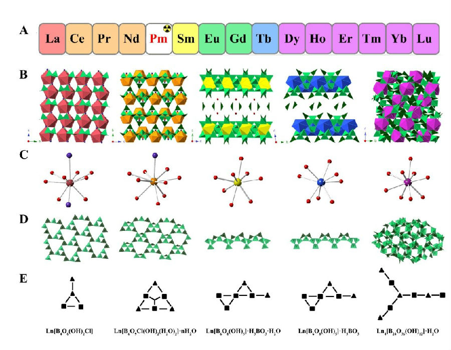 镧系元素是一种重要的战略资源,广泛的应用于光学、磁学、催化等领域,同时也是核乏燃料中的重要裂变产物。15个镧系元素在溶液和固体中均呈现相同的三价价态和相似的化学性质,相邻元素之间平均离子半径差距只有0.01 ?,整体与三价锕系镅,锔的化学性质都极为相近。因此三价镧系元素之间以及三价镧锕分离在工业和基础研究上都有显著的挑战性。王殳凹教授团队长期致力于镧系锕系元素固体化学研究。在之前的工作中,发现在熔融硼酸反应里三价镧系锕系在复杂晶格作用下结构出现非连续性变化(Angew. Chem.Int. Ed.,2010,49, 1263-1266; J. Am. Chem. Soc.,2012,134,10682–10692; Angew. Chem. Int.Ed.,2012, 51, 1869 –1872;Angew. Chem. Int.Ed.2011, 50, 8891 –8894),并提出了基于晶格鉴别能力分离的新策略。近期在熔融硼酸盐反应中他们又发现了新的可以最大程度鉴别三价镧系元素的晶格系统,并将这种新策略逐步推向应用。