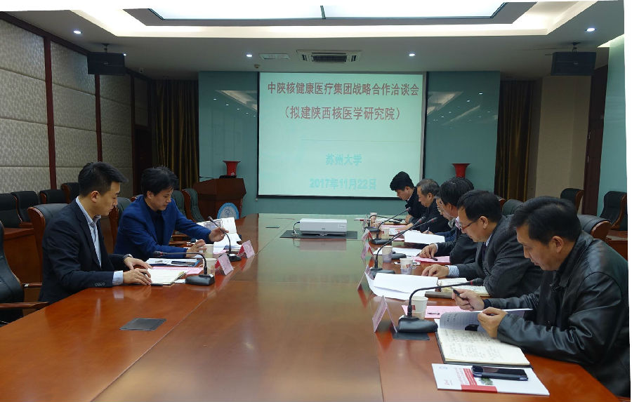 为了充分发挥学校的人才、学科和教学科研优势,促进成果转化,学校于2017年11月22日下午3点在医学楼一楼A101会议室举行与中陕核健康医疗集团战略合作(拟建陕西核医学研究院)洽谈会。中陕核健康医疗集团周小卫总经理、张林副总经理、苏州大学国内合作办公室吉伟副主任、继续教育处缪世林处长、医院管理处综合办蒋敬主任、医学部基础医学与生物科学学院党委薛辉书记、医学部放射医学协同中心党委曹建平书记、医学部公共卫生学院党委芮秀文书记等参加了此次洽谈会。会议由芮秀文主持。