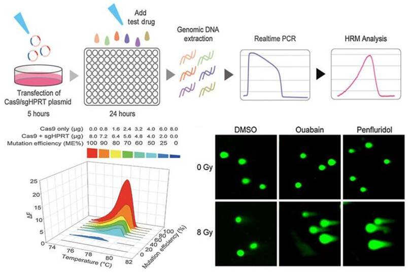 该课题组利用基于基因组定点编辑技术CRISPR/ Cas9在基因组中定点诱导DSB,荧光定量PCR仪扩增打靶片段并通过高分辨率熔解曲线(high-resolutionmelting,HRM)分析来检测细胞NHEJ修复活性,从而构建一种高通量NHEJ修复抑制剂筛选体系,发现以乌本苷为代表的强心苷类药物和以五氟利多为代表的抗精神病类药物均有明显的NHEJ修复抑制作用。进一步研究发现二者可能通过间接性抑制电离辐射所致的DNA-PKcs磷酸化来提高肿瘤细胞的辐射敏感性,为临床辐射增敏药物的开发提供了新的理论基础和研究方法。