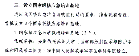 鉴于苏州大学放射医学的特色以及在国内外的影响力,由国家卫生计生委应急办推荐,2014年12月30日,国家核事故应急协调委员会发布《关于设立首批国家级核应急专业技术支持中心和救援分队及培训基地的通知》(国核应委[2014]6号),将苏州大学设立为首批国家级核应急医学救援培训基地。