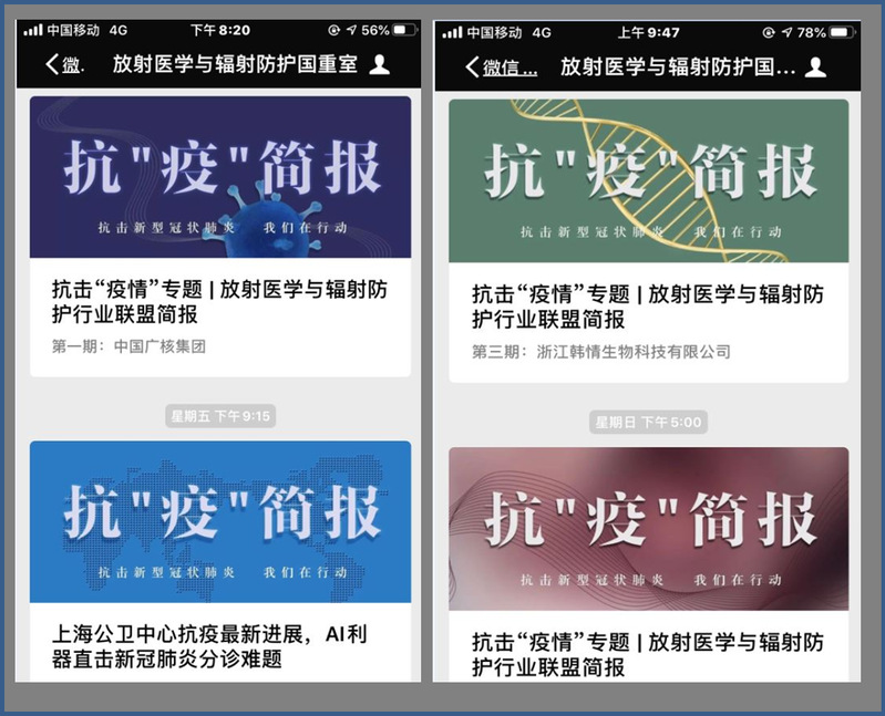 “生命重于泰山,疫情就是命令,防控就是责任”,本次全国抗击新型冠状肺炎疫情的战斗中,由放射医学协同创新中心发起成立的“放射医学与辐射防护行业联盟”68个成员单位,认真贯彻党中央、国务院决策部署,全国一盘棋,紧急行动、快速响应、积极应对,在防控、医疗、科研、生产等各条战线,发挥各自特长,各显神通,为本次阻击疫情做出了应有的贡献。中心专题编写了放射医学与辐射防护行业联盟抗“疫”专题简报,为联盟单位相互交流学习、共克时艰发挥了积极作用。