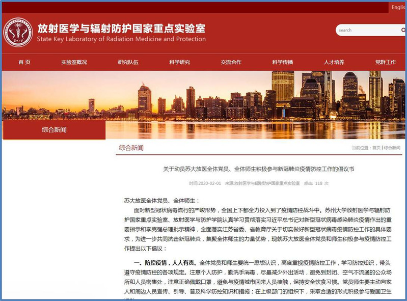 2月1日,放射医学协同创新中心率先动员全体党员、全体师生积极参与新冠肺炎疫情防控工作的倡议书,要求党员同志冲锋在前,彰显担当。