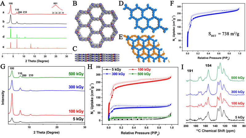 固体核磁(13C-NMR)、粉末衍射(PXRD)和N2吸附测试表征充分表明了材料的化学结构、结晶特性和多孔性(图2)。通常辐射对材料具有一定的破坏性,通过研究不同吸收剂量下的合成,发现吸收剂量对COFs的结晶、比表面积、形貌和热稳定性都有影响,结果表明100 kGy的吸收剂量最适合COFs的合成(图2)。