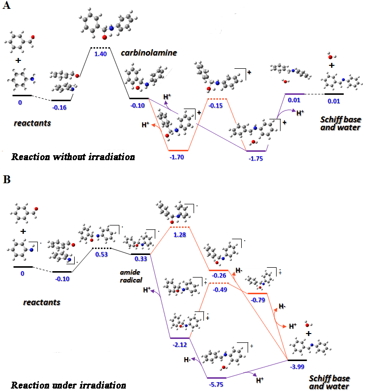 图3 未辐照(A)与辐照(B)体系下的反应路径能线图