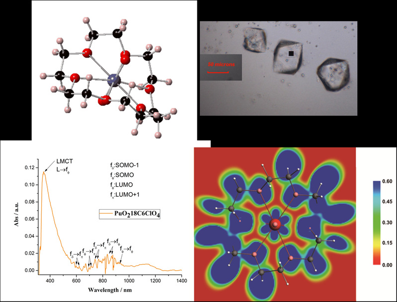 目前学术界对于钚元素广泛熟知的是乏燃料后处理、高放废物处置过程中常见的四价钚和六价钚,对于钚其他价态的认识仍十分有限。以剑桥晶体学数据库统计结果为例,目前为止仅有197例钚晶体结构化合物(而广泛熟知铀化合物高达7500例,稳定元素铁的化合物高达50000例),其中五价钚的结构报道仅有4例,其实验谱学性质和电子结构研究仍属空白。五价钚的合成难点在于其极易歧化成为四价和六价,同时在强配位配体作用歧化动力学进一步放大,使得结晶极为困难。本工作中,针对五价钚的歧化难题,研究人员引入具有合适尺寸的中性穴醚类配体,在还原过程中形成陷阱络合PuVO2+离子,这种弱配位能力的配体完全包裹PuVO2+形成强的空间位阻效应,延缓五价钚歧化,克服了合成上的难题,从而获得了首例五价钚的冠醚类化合物PuVO2[18-crown-6]ClO4。同时,研究人员首次从实验上获得了五价钚单晶电荷跃迁吸收谱。进一步,理论计算表明五价钚的电子基态为[core]5fδ25fФ1,钚的5f6d轨道与冠醚氧的2p电子形成配价键,平面方向以离子键为主,轴线钚氧之间为强烈的共价键。该工作为介稳态超铀元素的合成与制备提供了可行思路,也正式开启了国内钚的实验配位化学研究。