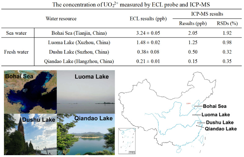 图2. 不同水源水样使用ECL及ICP-MS两种手段检测UO22+结果对比及水源地位置。
