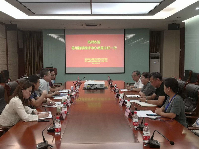 8月11日下午,苏州智慧医疗创新中心毛勇主任一行到放射医学协同创新中心交流。出席本次交流会的有苏州智慧医疗创新中心毛勇、首席科学家罗章维博士,副主任姜文理,合作部缪王佼;苏州大学医学部放射医学与防护学院院长、放射医学与辐射防护国家重点实验室主任柴之芳院士,执行院长、国重室副主任高明远,学院常务副院长曹建平,国重室综合办公室主任徐加英。交流会由曹建平主持。