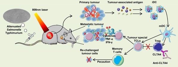 此外,由于细菌可以激发机体的免疫反应,发挥类似免疫佐剂的功能。因此,在细菌诱导的肿瘤光热消融后,会进一步引发抗肿瘤免疫反应,特别是在与免疫检查点阻断治疗相结合后,可实现对远端肿瘤的有效抑制,并通过免疫记忆效应抑制肿瘤的复发。该研究表明细菌本身可以作为肿瘤特异性光热免疫治疗试剂,考虑到减毒细菌已经在临床试验中进行过尝试,该技术具有一定的临床转化潜力。