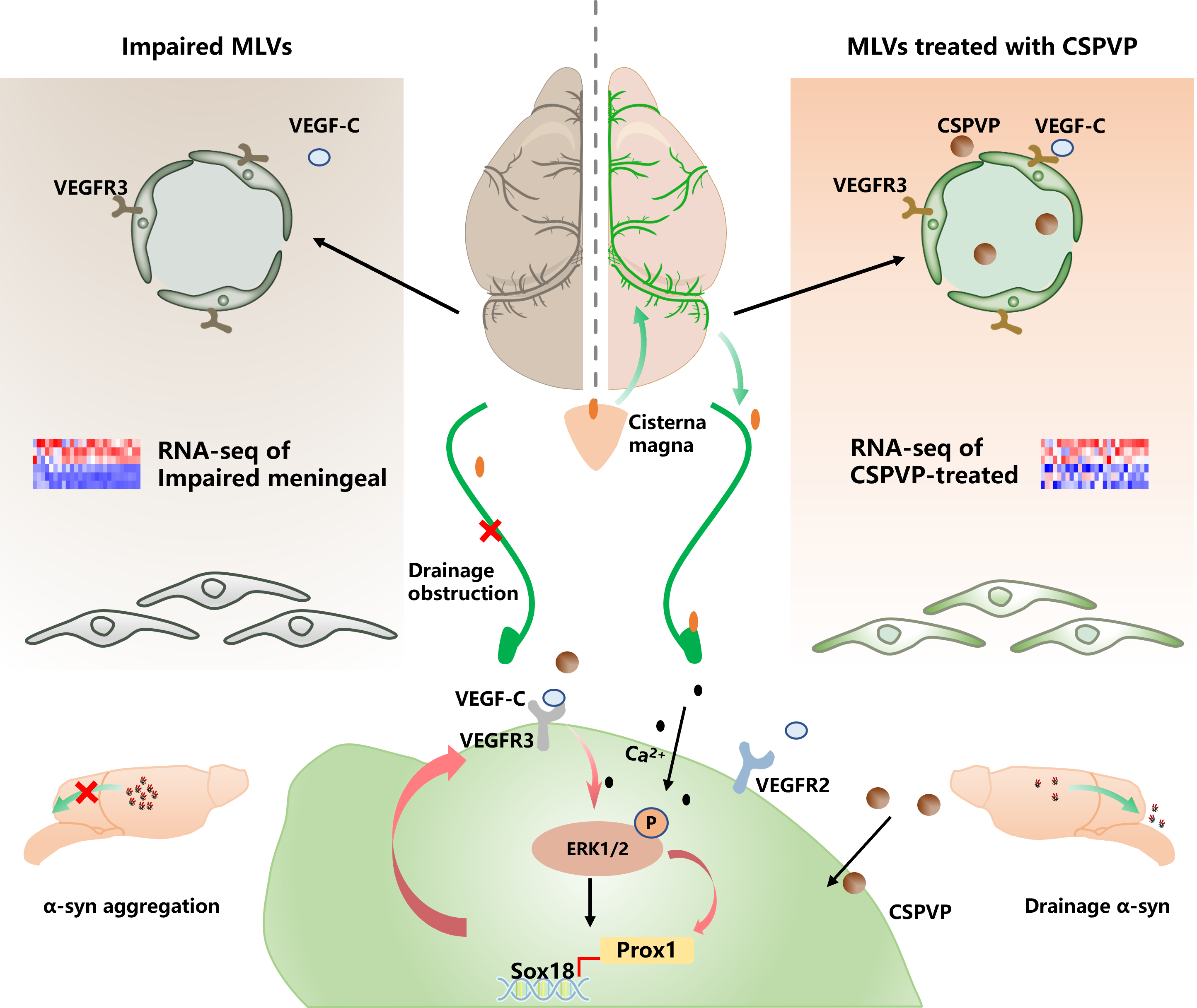 图1. CSPVP纳米颗粒通过激活淋巴管内皮细胞的VEGF-C/VEGFR3信号通路,修复受损脑膜淋巴管而恢复引流功能的示意图
