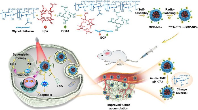 图1.99mTc/177Lu-GCP-NPs的合成过程及电荷转换机制与RNT-PDT结合发挥协同抗肿瘤作用的示意图