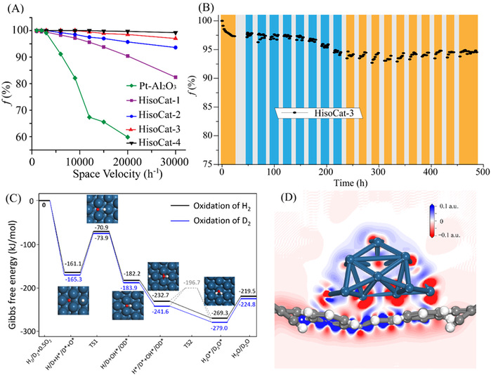 图2.(A)空速对H2转化率的影响;(B)重启性能(橙色:运行,灰色:暂停);(C) H2/D2在Pt(111)表面氧化的吉布斯自由能曲线;(D)支撑铂团簇的电子密度差图