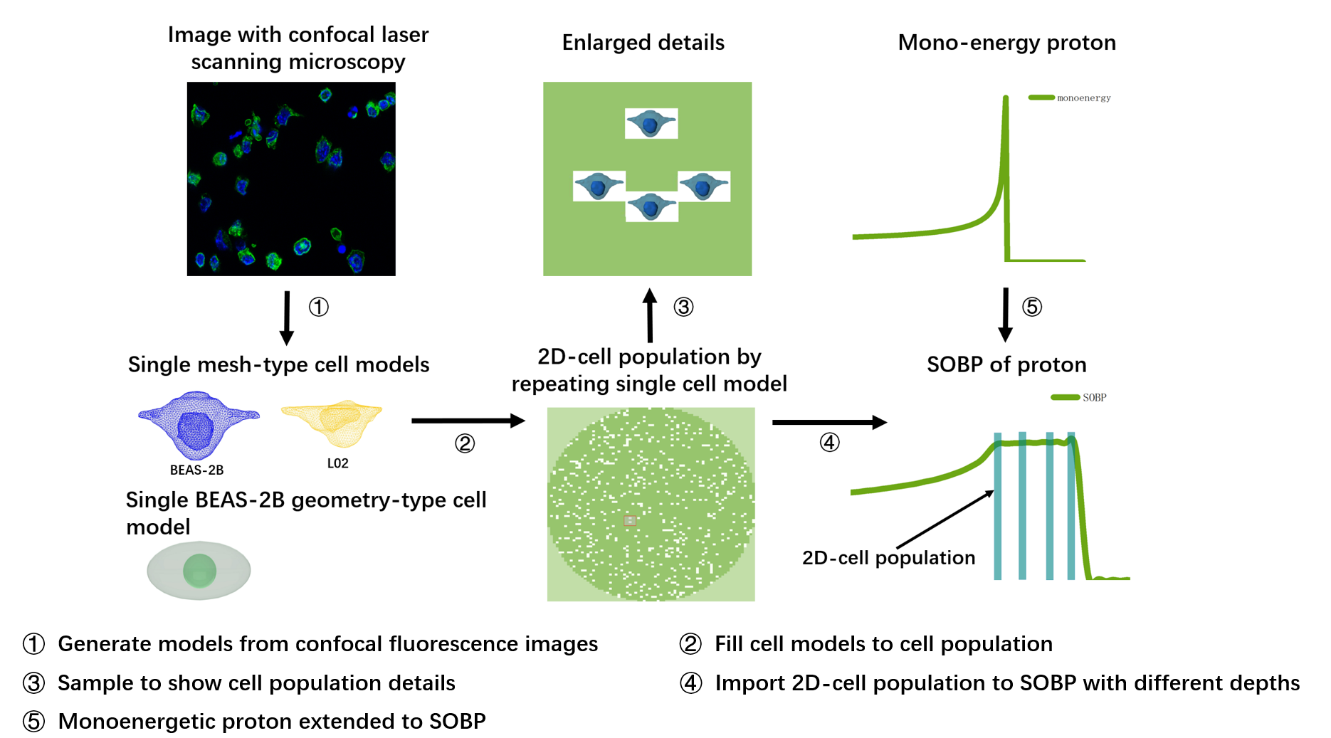 图1:细胞群落模型的构建与其用于质子SOBP剂量评估流程