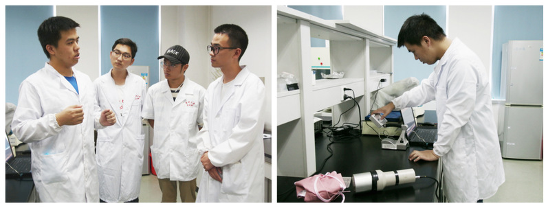 在防辐射服防辐效果演示中,队员们在张烨锋老师的指导下,观摩并亲自测量了孕妇防辐射服的防辐效果。张老师在向队员们简单介绍测量所用的仪器及原理后,拿出了事先准备好的样品,测量其辐射峰值以作为对照组。接着便依次将队员们准备好的三种不同价位不同厚度的防辐射服包裹住样品,再测量其辐射峰值。通过实验结果的比对,大家最终得出结论:防辐射服并不能有效防住电离辐射γ射线。