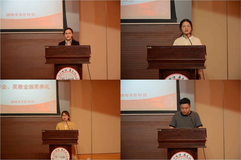 行业联盟徽标设计一等奖获得者顾佳同学、获奖本科生代表朱洁丽同学、获奖研究生代表郭子扬同学分别上台发言。获奖同学们对老师以及企事业单位设立奖学金表达了由衷的感谢,表示获得奖学金不是终点,而是新的起点,在今后的学习生活中踏踏实实做好每一件事情。
