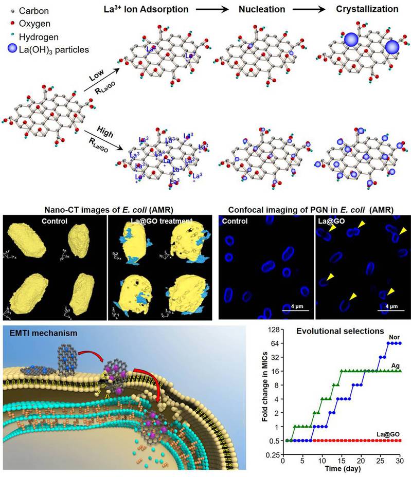 在最新研究中,李瑞宾教授的团队设计一种氧化石墨烯与稀土氧化镧的新型纳米复合材料(La@GO)。利用同步辐射技术,液相色谱-质谱及高分辨荧光显微镜等技术发现,该复合物具有细菌外多靶点侵袭(EMTI)的独特杀菌机制:与细菌膜接触后通过去磷酸化和脂质过氧化作用破坏细菌磷脂层,破坏细菌肽聚糖层。相比抗生素和银纳米粒子,该石墨烯复合物具有两个优势:①La@GO的杀菌性能不受已发现超级细菌耐药机制的影响;②在对超级细菌长期的压力处理下,La@GO不会引发细菌耐药性的进化(图1)。