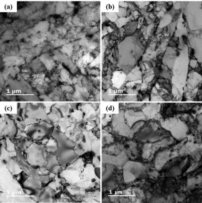 (a) 未处理,(b) 1次热处理,(c) 5次热处理,(d) 10次热处理