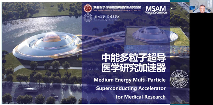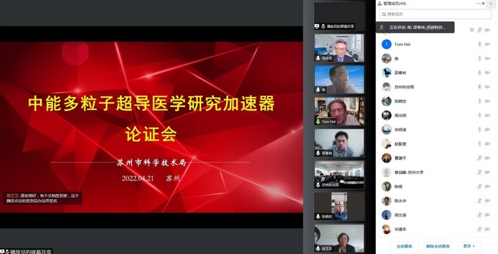 2022年4月21日上午,苏州市科技局组织召开了 “中能多粒子超导医学研究加速器”线上专家论证会。江苏省教育厅二级巡视员张兆臣、江苏省科技厅主任科员张传晖、苏州市科技局副局长顾万勇、处长廖希明、副处长周旭平,昆山市科技局副局长马丽等出席会议;论证会邀请了中科院上海高等研究院赵振堂院士、宁波大学赵玉芬院士、中国科学院合肥物质科学研究院副院长宋云涛、中国原子能科学研究院同位素研究所研究员罗志福、复旦大学放射医学研究所书记邵春林、上海质子重离子医院院长助理孔琳、中科院上海高等研究院主任张满洲、美国哥伦比亚大学放射肿瘤系常务副主任Tom Hei、中国科学院近代物理所研究员宋明涛等国内外加速器及放射医学领域知名专家组成专家组;苏州大学副校长张晓宏、科学技术研究院书记蒋敬东、常务副院长钱福良、科长施雪奎等校及相关职能部门领导,以及我中心柴之芳院士、王成奎书记、高明远教授、曹建平教授、王殳凹教授、周光明教授、华道本教授及项目组成员等,共60余人参会。会议分别由顾万勇副局长和赵振堂院士主持。