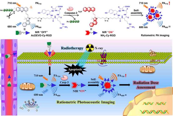 在最新的研究进展中,史海斌教授课题组创新性地研发了一种肿瘤靶向的caspase-3酶响应型近红外荧光探针,并用于放化疗肿瘤细胞的凋亡过程的实时可视化监测研究。该探针主要由半花菁类荧光染料、caspase-3酶特异性识别和响应的DEVD多肽以及肿瘤靶向基团三个部分组成。探针起初的近红外荧光信号被DEVD所压制,处于关闭状态。在caspase-3酶的作用下,DEVD肽被酶后,探针的荧光信号被“点亮”,同时还会产生比率型变化的光声信号(PA680/PA710)。此外,酶切后探针会原位发生自组装,产生大的纳米颗粒,从而延长探针在病灶的滞留时间,以便于开展原位长窗口期的成像研究。最值得关注的是,利用比率型光声成像技术的强组织穿透性(~5 cm)、高成像灵敏度、高分辨率和活体定量分析准确的优势,实现了对caspase-3酶活依赖的细胞凋亡过程的原位实时成像监测及在体辐射剂量的准确定量评估,为临床开展辐射剂量评估研究提供了新思路。