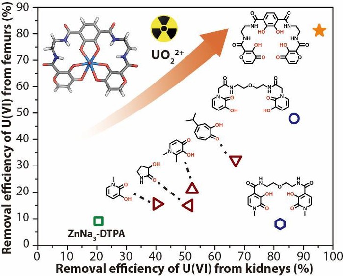 铀是核能的重要原料,在核工业中被大量使用。一旦发生核泄漏事故,铀可能在环境中扩散并通过呼吸道、消化道或皮肤粘膜进入体,随血液循环分布体内各处,最终主要以铀酰离子(UO22+)形式存在并沉积在骨骼和肾脏中。由于铀具有重金属毒性以及长期的放射性,体内沉积的铀酰可导致肾损伤,增加罹患骨肉瘤等疾病的风险。螯合疗法通过使用促排剂与铀酰在体内有效结合并随代谢系统排出体外,可有效降低铀酰对人体的危害,被认为是当前解决这一问题最可行的手段。王殳凹教授和第五娟教授团队一直致力于锕系元素配位化学研究,据此设计了一系列高效促排剂,在核应急及辐射防护领域具有良好的应用潜力(Nat. Commun.2019, 10, 2570;Angew. Chem. Int. Ed. 2021, 60, 1646)。由于骨骼中磷酸盐对铀酰的强螯合能力,多数促排剂包括DTPA类临床药物的促排效果尤其是骨骼促排率极为有限,因此铀酰的骨骼促排仍是促排剂研究领域里尚未解决的关键问题。