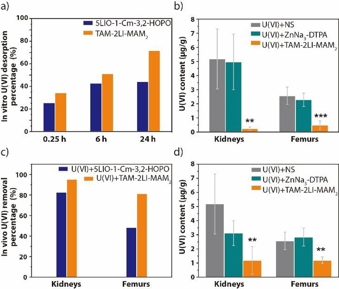 随后,团队在理论指导下设计合成了目标配体,并对配体及其铀酰配合物进行了一系列表征。晶体结构数据表明该配体可在赤道平面与铀酰离子形成稳定络合,且U-O键长与计算结果非常接近。光谱滴定实验结果证实TAM-2LI-MAM2在络合能力上优于四齿的5LIO-1-Cm-3,2-HOPO配体。在羟基磷灰石(HAP)对铀酰离子进行吸附后,使用上述两种配体进行解吸附实验,结果表明TAM-2LI-MAM2的解析率明显高于5LIO-1-Cm-3,2-HOPO,验证了其与铀酰络合能力的优势(图2a)。细胞毒性实验数据证明该配体自身毒性以及其与铀酰的综合毒性与当前临床药物ZnNa3-DPTA大致相当,细胞促排实验结果也表明该配体具有非常好的促排效果。