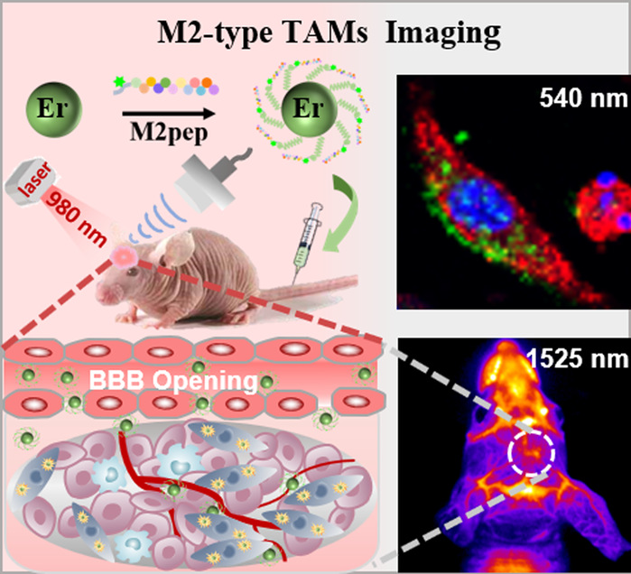 在前期工作中,分子影像与核医学研究中心团队构建了一系列基于稀土纳米颗粒的多功能影像探针用于肿瘤及血管的多模态成像(Biomaterials, 2018, 175, 30-43;Bioconjugate Chem., 2020, 31, 340-351;Sci. Bull., 2022, 67, 461-465;Small Methods, 2022, 6, 2101145),并利用染料敏化策略显著增强探针的NIR II荧光,实现了原位GBM的NIR II荧光成像、成像引导下的手术切除和气体控释治疗(Biomaterials, 2019, 219, 119364;Nano Today, 2020, 34, 100905;Adv. Healthcare Mater., 2022, 11, 2102042)。在上述工作基础之上,研究团队进一步调控纳米探针的结构、离子掺杂比例,壳层厚度,构建了具有较强上下转化荧光和热效应忽略不计的纳米探针,并耦联特异性靶向M2型TAMs多肽,使其在最低功率的980 nm激光激发下,实现了M2型TAMs的体内外靶向成像。研究结果表明所构建的特异性探针在M2型TAMs成像方面具有较大潜力。