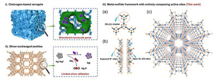 图1. 两类传统材料硫基气凝胶(i)和银基沸石(ii)的不足和本工作中锡硫化物材料碘的设计理念与结构示意图