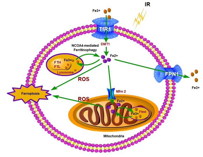 本研究揭示了放射性肠损伤中的铁过载和细胞铁死亡现象,机制研究表明电离辐射促进了介导铁蛋白自噬的货物受体----核受体共激活因子4 (NCOA4)的表达,NCOA4随后介导了胞浆铁蛋白的自噬降解。铁蛋白的降解进一步释放了大量的游离铁,并进而激活了位于线粒体膜上的线粒体铁转运蛋白2 (Mfrn2)。胞质游离铁通过Mfrn2转运到线粒体并导致线粒体中铁过载和过量ROS的产生,最终触发肠上皮细胞脂质过氧化和铁死亡(图1)。使用铁螯合剂去铁胺(DFO)或缺铁饮食干预可显著减少铁过载和铁死亡的发生,减轻小肠黏膜损伤,从而提高致死剂量全腹照射小鼠的存活率,为防治放射性肠损伤提供了新思路和新靶点。