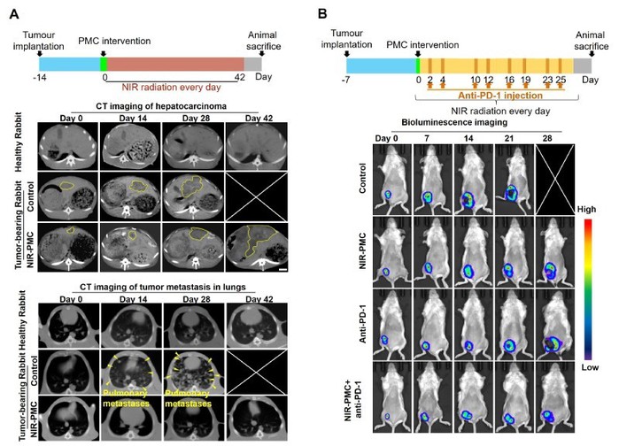 A) 微氧工厂对小兔肝癌影响评价;B) 微氧工厂辅助小鼠4T1乳腺癌免疫治疗评价
