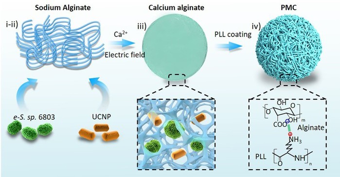 肿瘤细胞的快速增殖及代谢通路的改变,导致实体瘤长期处于乏氧状态。肿瘤乏氧微环境会促进肿瘤的侵袭和转移。同时,乏氧微环境也会激活腺苷通路(hypoxia/HIF-1α/adenosine/A2AR axis),增强肿瘤细胞的免疫逃逸能力,减弱免疫治疗效果。目前,临床上主要通过高压氧仓提高血液溶解氧含量,但是该方法是一种全身系统性供氧方法,精准性差,只能短暂缓解肿瘤乏氧微环境,且可能导致氧中毒等副作用。实验研究主要采用载体递送的方式,如纳米载体,全氟化碳等人工合成材料,以直接或间接的方式为肿瘤组织短暂供氧,无法持久改善肿瘤乏氧微环境。针对该问题,考虑到植物微生物光合作用具有持久温和供氧的特征,李瑞宾教授团队将纳米材料与驯化蓝藻封装于海藻酸钙的凝胶微球,构建了微型氧气工厂(图1)。该产氧微工厂可以将红外激光辐射转化为可见光供植物光合作用,能够实现深层体内组织的持久供氧。