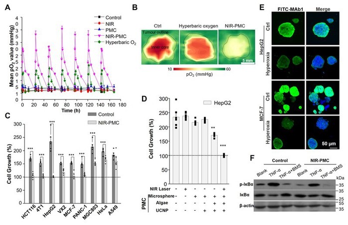 该研究中首次将植物微生物光合作用用于肿瘤乏氧微环境的改善。在多种肿瘤模型证明PMC具有改善肿瘤乏氧微环境的性能。该氧气微工厂在临床上具有较高的可实施性,可以通过介入途径植入肿瘤部位,成为化疗、靶向治疗、放射治疗、免疫治疗的有效辅助手段。同时,PMC系统的构建也为高氧微环境下的肿瘤生物学研究提供了有力的实施工具。我中心王威力博士和郑会珍副研究员为该工作的共同第一作者,李瑞宾教授为通讯作者。该研究得到了国家自然科学基金委(21976126), 江苏省自然科学基金(BK20211545),科技部重点研发项目(2020YFA0710700)和吴阶平医学基金会临床科研专项(320.6750.19092-32)的支持。